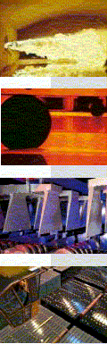 At the heart of the world's glass industry is the float process - invented by Sir Alastair Pilkington in 1952 - which manufactures clear, tinted and coated glass for buildings, and clear and tinted glass for vehicles. The process, originally able to make only 6mm thick glass, now makes it as thin as 0.4 mm and as thick as 25 mm. Molten glass, at approximately 1000°C, is poured continuously from a furnace onto a shallow bath of molten tin. It floats on the tin, spreads out and forms a level surface. Thickness is controlled by the speed at which solidifying glass ribbon is drawn off from the bath. After annealing (controlled cooling) the glass emerges as a 'fire' polished product with virtually parallel surfaces.