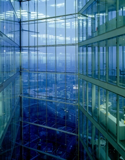 Suncool™ 70/35 in der Primärfassade erreicht man eine Lichttransmission von 47 Prozent sowie einen g-Wert von 27 Prozent. Verwendet man alternativ ein Wärmedämmisolierglas als Raumabschluss, werden eine Lichttransmission von 53 Prozent und ein g-Wert von 37 Prozent erzielt.