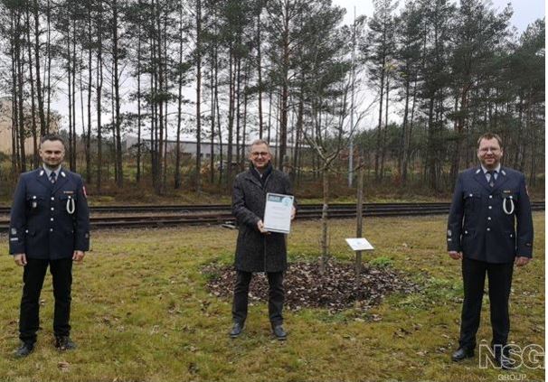 Foto: Werksleiter Gerhard Ruhland und die Feuerwehrmänner Andreas Kick und Dominik Zwack, stellvertretend für alle ehrenamtlich Helfenden am Standort, mit der Urkunde.