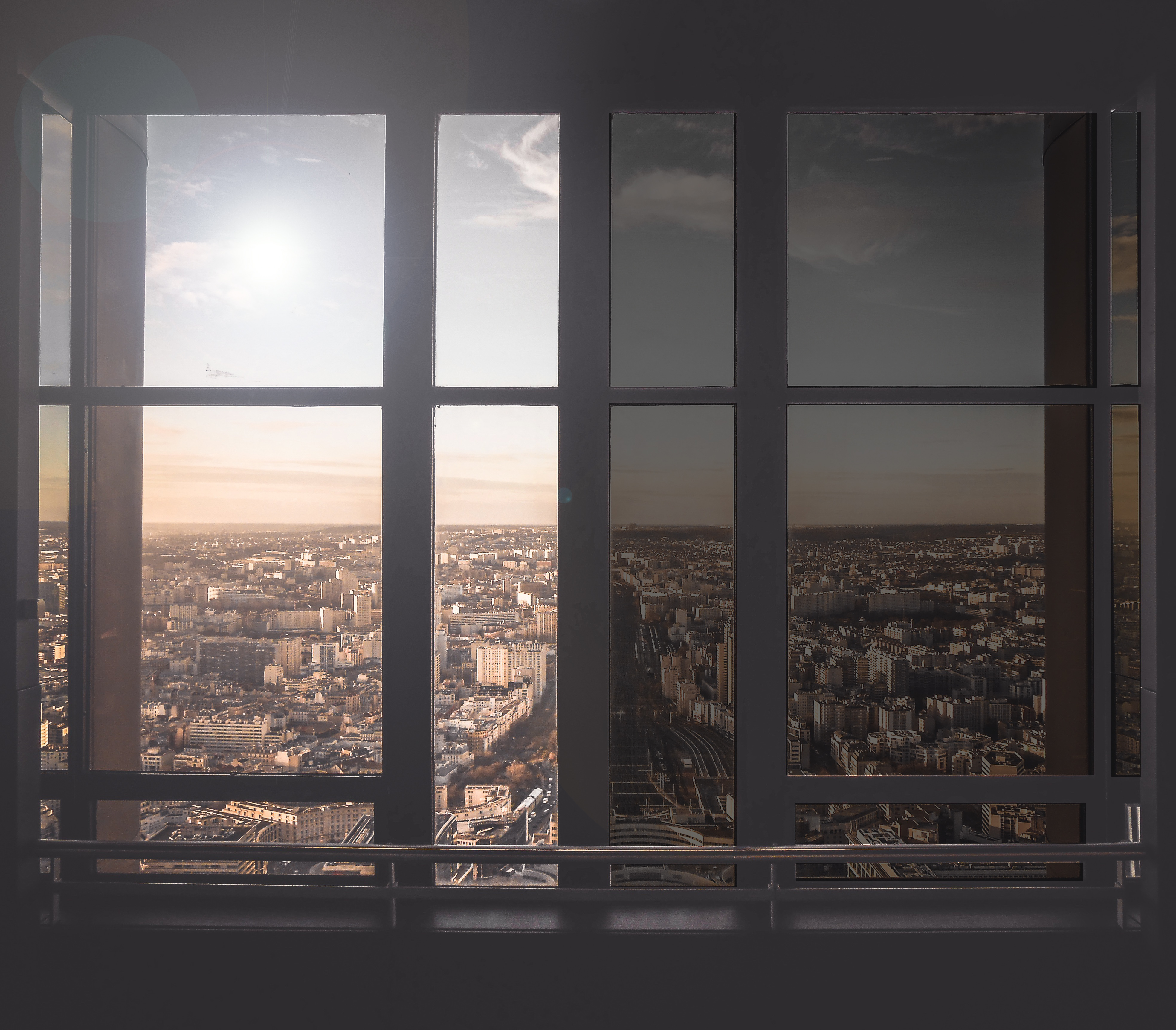 Das Sonnenschutzglas funktioniert im Zusammenspiel von direkter Sonneneinstrahlung und Wärme. Dafür sorgt der Verbund zweier teilvorgespannter Gläser mit einer speziellen thermochromen PVB-Folie. Steigt die Temperatur auf der Scheibe durch die direkte Sonneneinstrahlung an, reagiert die thermochrome Folie auf die Wärme und sorgt für eine Abtönung des Glases. Das Glas bleibt aber auch im getönten Zustand lichtdurchlässig und ermöglicht einen klaren, verzerrungsfreien Blick nach draußen. Lässt die Sonneneinstrahlung nach und kühlt die Verglasung wieder ab, hellt sich das Glas wieder auf.