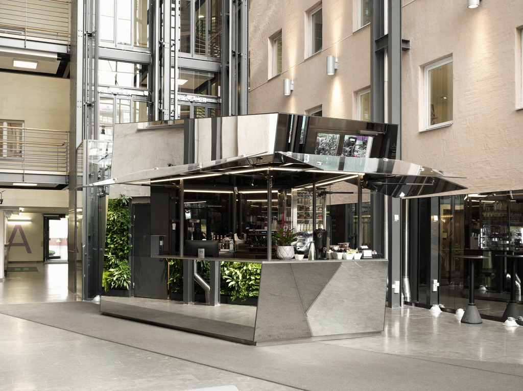 Im Eingangsbereich des Bürogebäudes steht ein neues futuristisches Café, das gleichzeitig als Rezeption für die Besucher des Bürogebäudes dient. Es besteht komplett aus verschiedenen Spiegelgläsern der Pilkington