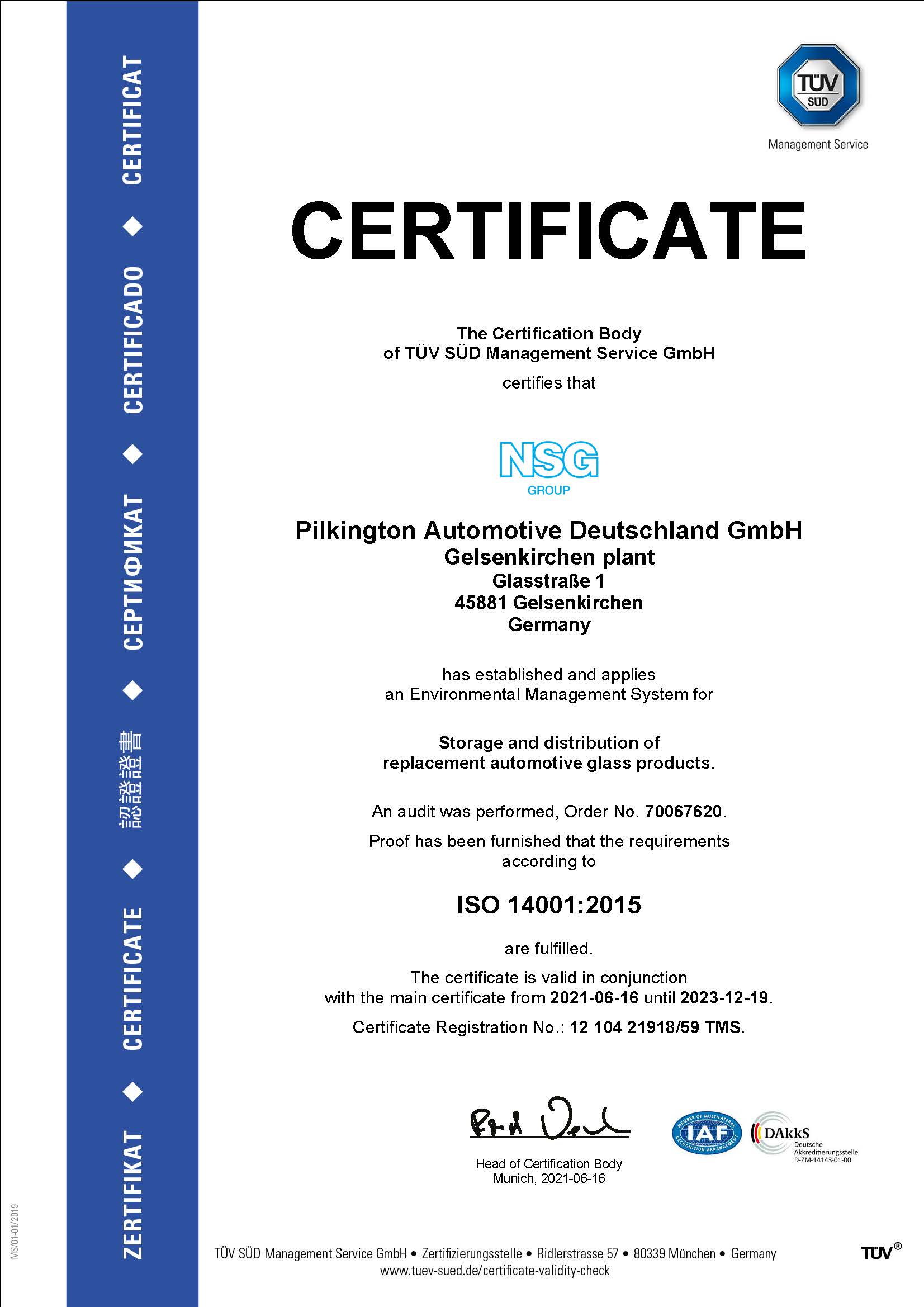 Das europäische AGR-Zentrallager am Standort Gelsenkirchen ist jetzt offiziell nach dem Umweltmanagement-Standard ISO 14001 zertifiziert und schließt sich damit den deutschen Standorten der Pilkington Automotive Deutschland GmbH an.