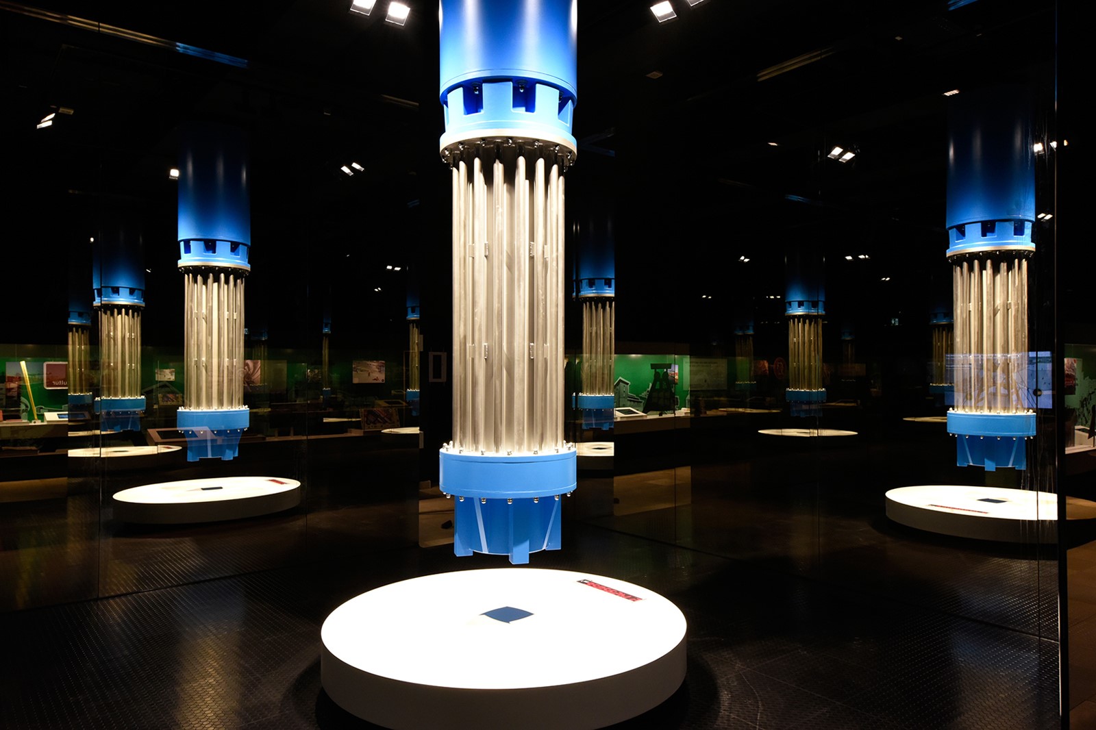 Die Spiegelinstallation besteht aus Pilkington Mirropane™ Chrome Spy, einem Chromspiegel, der besonders widerstandsfähig und variabel verarbeitbar ist. Durch eine entsprechende Beleuchtungssituation kann man von außen in den gläsernen Kubus hineinsehen, von innen jedoch sieht man die ausgestellte Pumpe in unendlicher Spiegelung. Pilkington Mirropane™ Chrome ist auch als blickdichte Variante Pilkington Mirropane™ Chrome Plus oder als farbiger Spiegel in den Farben grau, bronze und blau erhältlich.