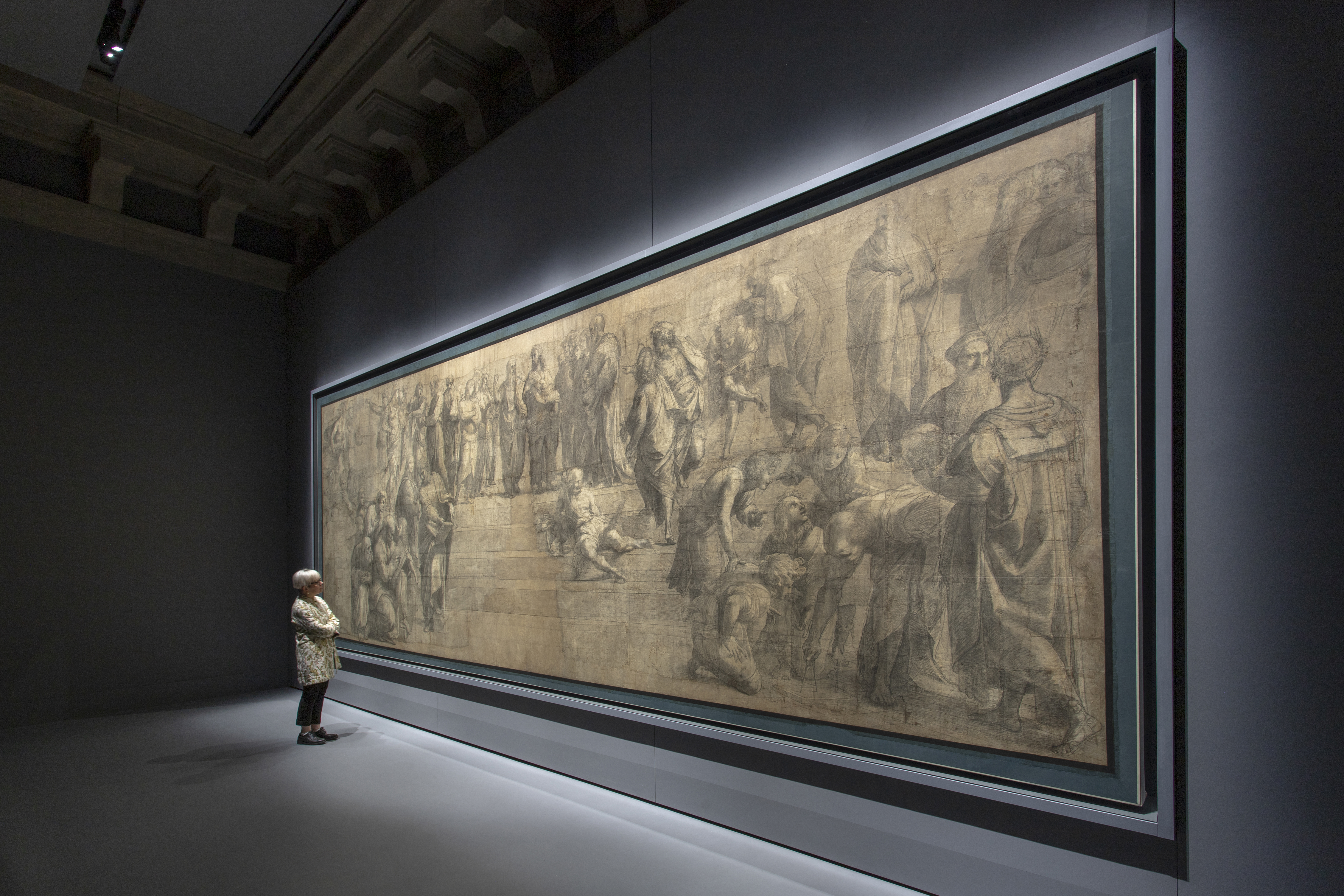 Ähnlich verhält es sich bei der Verglasung von Gemälden. Wie bei Vitrinen ist auch hier ein Aufbau des Glases denkbar, der mehrere Funktionen miteinander vereint, wie zum Beispiel Antireflexion mit UV-Schutz, farbneutraler Durchsicht und Schutz vor Vandalismus. Bei sehr großen Kunstwerken ist es sogar möglich, übergroße Gemäldeverglasungen anzufertigen. Die „Schule von Athen“ in der Pinacoteca Ambrosiana in Mailand (s. Foto) wird durch eine einzige 25 Quadratmeter große Scheibe geschützt, die aus zwei Scheiben Weißglas mit Antireflexionsbeschichtung besteht.