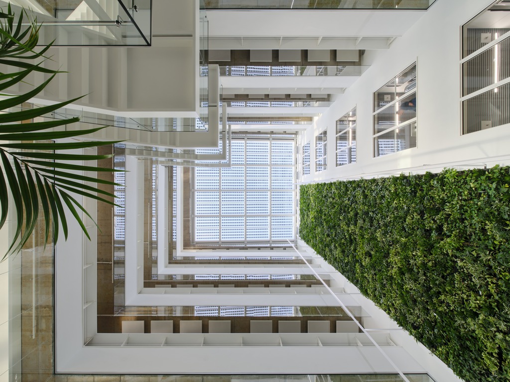 Nach dem Masterplan der Hafencity hätte die Dachfläche begrünt werden sollen – im Einvernehmen mit der Stadtplanung konnte jedoch ein Glasdach mit integrierter PV installiert werden. Die quadratischen PV Zellen in den Dachmodulen sind ein interessanter Blickfang und ergeben interessante, schachbrettartige Schatten im Atrium.