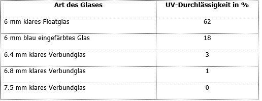 Verbundglas blockiert gewöhnlich mehr UV-Licht als getöntes Glas. Das liegt an der innenliegenden Folie, die zwischen zwei Glasscheiben laminiert wird. Diese besteht aus Polyvinylbutyral (PVB) und hält einen Großteil der UV-Strahlung ab. Die Übersicht zeigt einen Vergleich der Durchlässigkeiten von UV-Strahlung durch unterschiedliche Gläser: