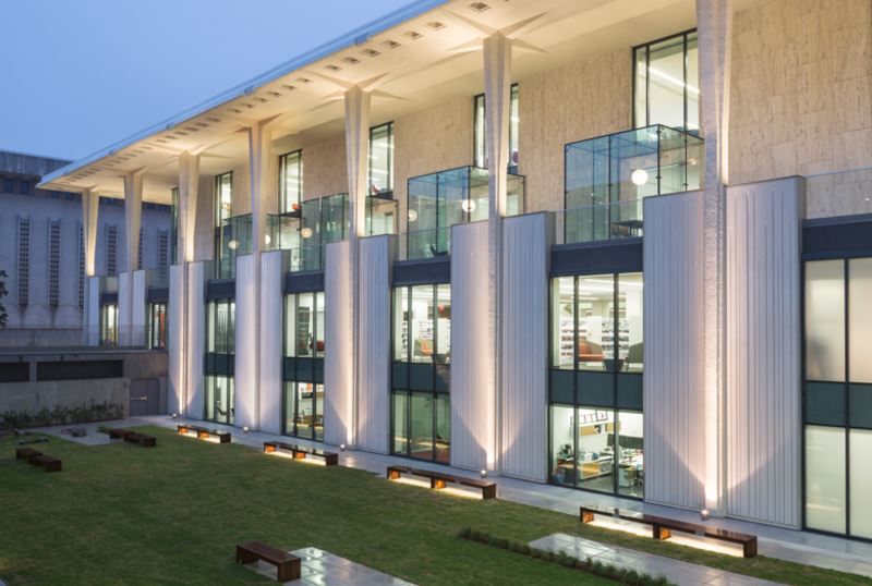 The most striking design addition is a series of glazed reading rooms on the second floor of the library, which take the form of protruding glass boxes. As well as creating new areas of well-lit indoor space that can be used all year round, these also let light flood into the whole interior.