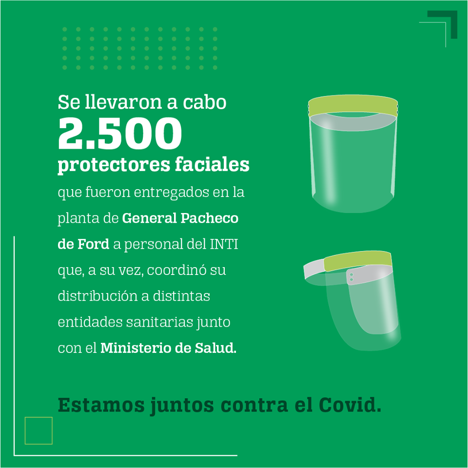 En este acto, se llevaron a cabo 2.500 protectores faciales que fueron entregados en la planta de General Pacheco de Ford a personal del INTI que, a su vez, coordinó su distribución a distintas entidades sanitarias junto con el Ministerio de Salud.
