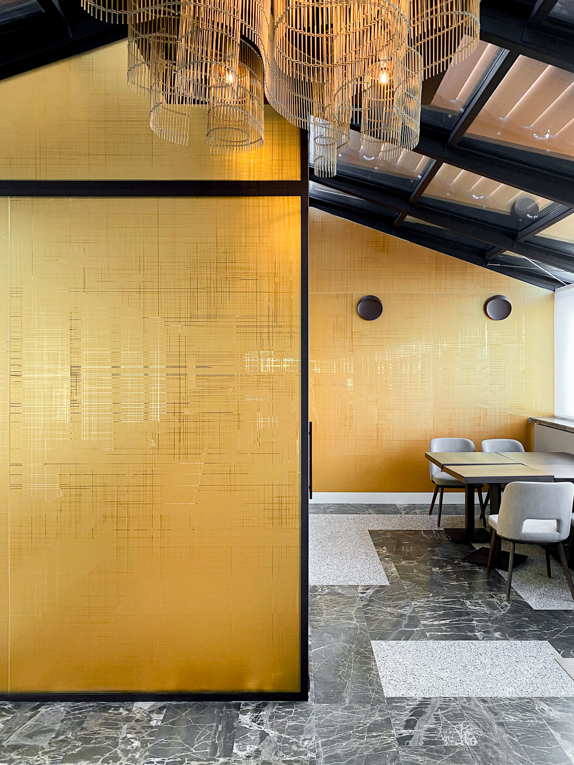 Lo studio di progettazione Gnosis ha scelto materiali in grado di rendere unici e accoglienti gli spazi interni e al contempo dare un tocco di raffinatezza agli ambienti, attraverso un dialogo sempre nuovo con la luce naturale. In quest’ottica è facile capire le motivazioni che hanno portato alla scelta del vetro riflettente dorato: in applicazione interna il vetro Pilkington Eclipse™ Gold 8mm, attraverso la lavorazione superficiale, è in grado di sorprendere per la luce filtrante attraverso lo spessore e per il meraviglioso riflesso dorato che lo contraddistingue. In tal modo, sia i banchi del bar del piano terra, come anche le partizioni vetrate del ristorante gourmet Macpherson del roof, pur diversificandosi per i motivi decorativi e per la quota di superficie interessata dalla satinatura, sono accomunati dai riflessi sempre nuovi che li attraversano e dalla plasticità mutevole con cui la luce li plasma alle diverse ore del giorno.