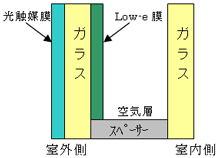 またこの技術の開発と平行し、遮熱高断熱複層ガラスに用いられるLOW-Eガラス(低放射ガラス)に関して、すぐれた製造技術と製造能力を有し、世界的にもトップクラスのメーカーである米国カーディナル社(当社業務提携先:下記2)と両社の強みを活かした共同開発を進めた結果、光触媒膜を室外側に、遮熱高断熱膜(LOW-E膜)をその裏面にコーティングする技術の確立に世界で初めて成功しました。