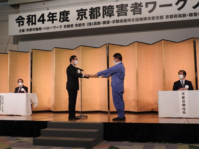 「障害者優良勤労者知事表彰」は、毎年9月の障害者雇用支援月間に、障害と向き合いながら長く勤務する個人に対し、その功績を評し京都府知事が実施する表彰です。今回受賞した当社社員は、勤続5年という期間の中で、上司をはじめ業務にかかわる人たちと十分なコミュニケーションを通じた関係性を構築し、事業所内備品のクリーニング業務に真摯に取り組む姿勢に加えて、作業の段取りを自ら組み立て、上司に対して職場環境の不安全事項や改善実施事項の報告を行っている点などが評価されたものです。当該社員は職場に無くてはならない大切な存在として、当社としても今回の表彰を大変喜ばしいものと受け止めています。