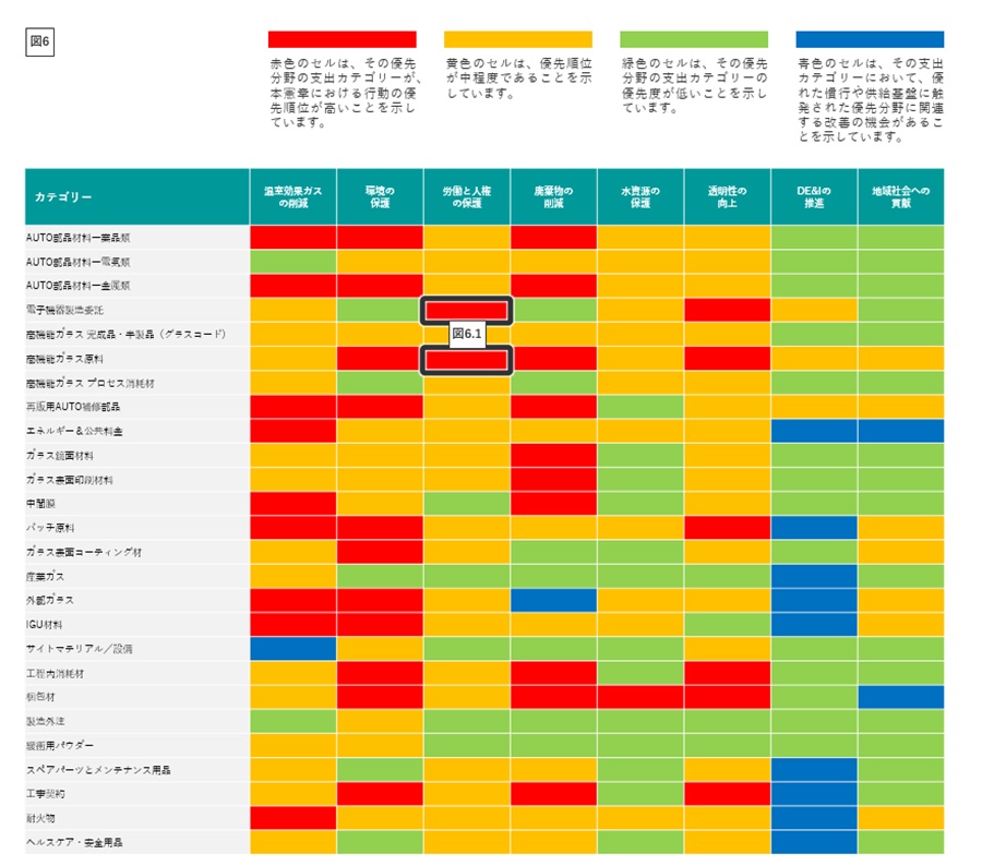 図6.1のヒートマップの例では、黒で囲まれたカテゴリーが「高機能ガラス事業(クリエイティブ・テクノロジー)」に関連する労働および人権(L&HR)の高リスク領域を示しています。
