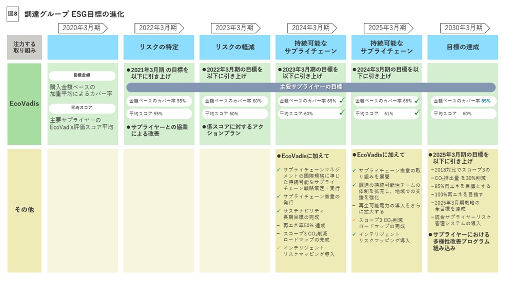 上記の施策と並行して、スコープ3の排出量を30%削減(2018年対比)させる目標の達成に向けた取り組みを加速しています(図8)。図8は、調達分野におけるESG目標の成熟度を示しています。この推進には部門横断で強力なガバナンス体制が導入されており、CEOが委員長を務めるグループ全体のサステナビリティ委員会に直接報告が行われます。