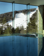 Do żeber szklanych zamocowano szyby zespolone fasady o wysokości 4,35 m i powierzchni sięgającej prawie 9 m². Szyby zespolone o konfiguracji: szyba zewnętrzna z neutralnego niskoemisyjnego szkła przeciwsłonecznego o grubości 12 mm, odstęp między szybami o szerokości 16 mm wypełniony powietrzem, szyba wewnętrzna z bezbarwnego szkła float o grubości 6 mm zostały wykonane ze szkła hartowanego. Wykorzystane szkło zostało także poddane termicznej obróbce (ang. heat soak test), po to, aby wyeliminować jego spontaniczne pękanie. W celu zagwarantowania bezpieczeństwa konstrukcji, przeszklenia zostały przeliczone dla obciążenia wiatrem na poziomie 1800 N/m², co odpowiada warunkom normowym dla terenów górskich.