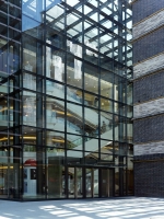 Łącznikiem między nową bryłą a zabytkowym obiektem stało się przeszklone atrium. Wykorzystano w nim szkło przeciwsłoneczne Pilkington Suncool™ 70/40 OW, które skutecznie chroni przed słońcem i jest niemal bezbarwne. Pilkington Suncool™ 70/40 OW to niestandardowy produkt, w którym powłoka przeciwsłoneczna jest nałożona na szkło Pilkington Optiwhite™ – bezbarwne szkło o obniżonej zawartości żelaza, pozbawione charakterystycznego dla zwykłego szkła float delikatnego zielonkawoniebieskiego odcienia. Wysokoefektywna przeciwsłoneczna powłoka Pilkington Suncool™ 70/40 gwarantuje właściwą kontrolę nasłonecznienia i doskonałe parametry izolacyjności cieplnej, co jest istotne dla fasad o dużych powierzchniach przeszkleń. Z kolei jej wyjątkowo neutralny charakter i wysoki współczynnik przepuszczalności światła pozwalają uzyskać bardzo wysoką transparentność fasady.